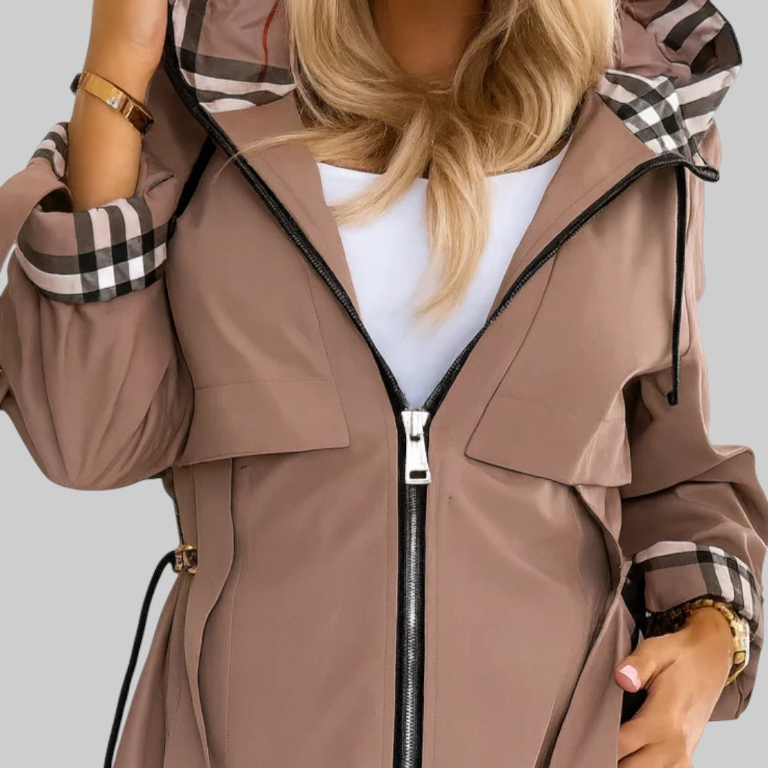 OLGA ELEGANTNÝ A MODERNÝ TRENČKOT s kapucňou a štýlovými károvanými detailmi, ktoré podčiarkujú jeho sofistikovaný vzhľad. Ľahká a ochranná tkanina ho robí ideálnym na prechodné obdobie – spája eleganciu s praktickosťou. Pás s opaskom krásne zvýrazní siluetu, zatiaľ čo zips a hlboké vrecká dodávajú modelu funkčný a zároveň chic charakter.