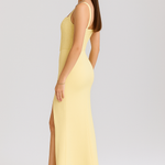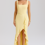 Navrhnuté tak, aby lichotilo, toto jemne žlté midi šaty kombinujú eleganciu s hravým nádychom. Volánový lem pridáva každému kroku pohyb a šarm.