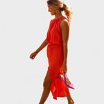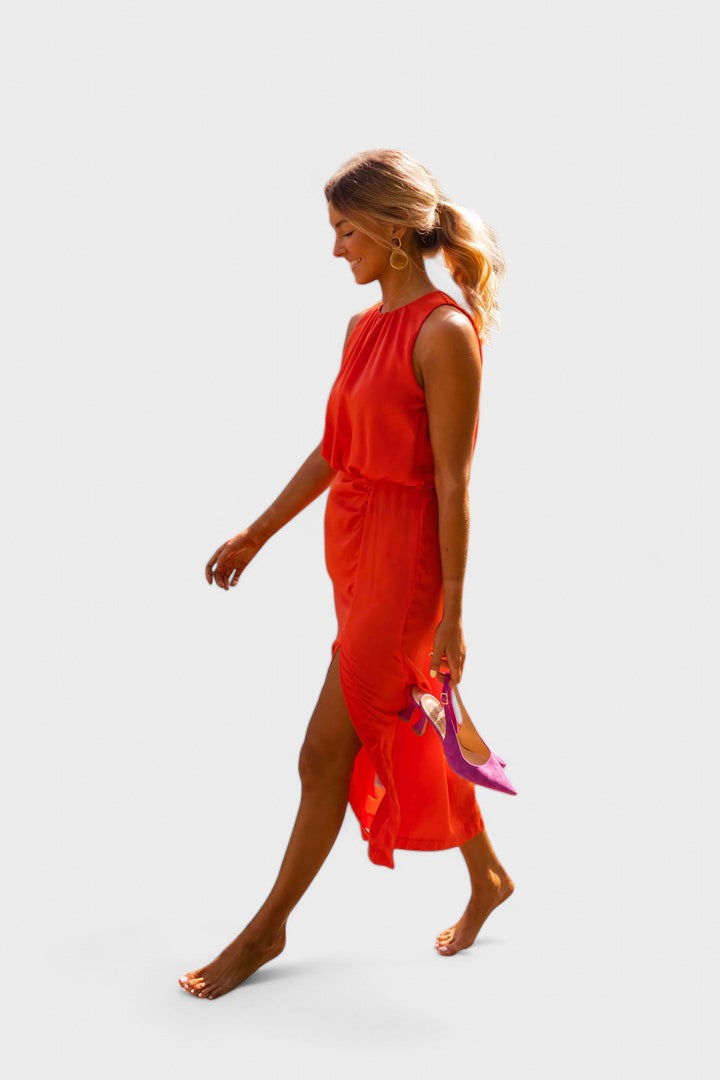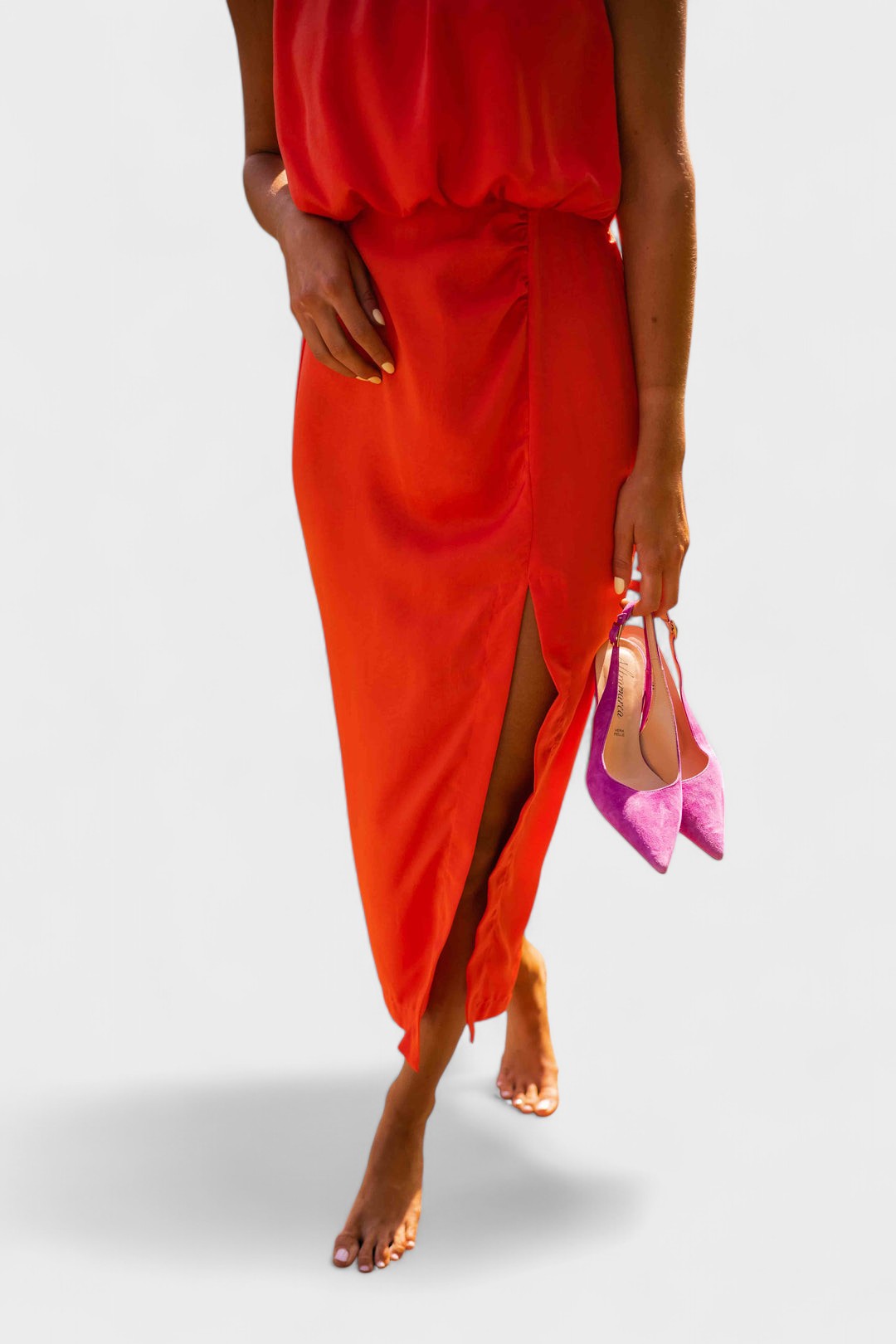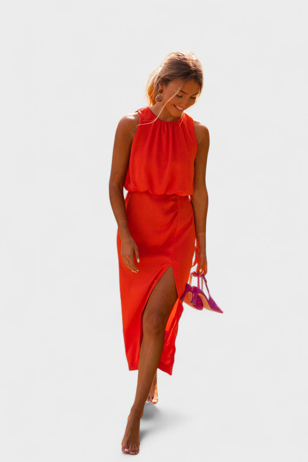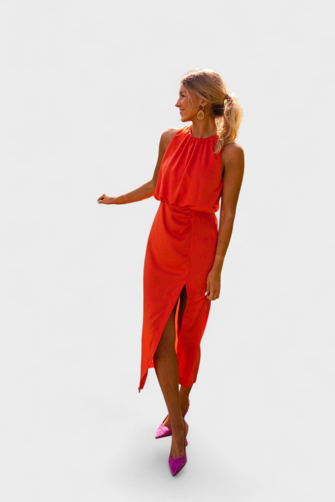 Nechajte sa uniesť slnečným pôvabom midi šiat, ktoré spájajú voľný, moderný strih s osobitou charizmou. S midi dĺžkou, rozparkom vpredu a halterneck výstrihom sú tieto šaty dokonalou voľbou pre každého, kto túži po elegantnom vzhľade s odvážnym nádychom. Ľahký materiál a dokonalé padnutie poskytujú siluete šarm a pohodlie, zatiaľ čo žiarivá oranžová farba vyžaruje sebavedomie a štýl. Dokončite outfit výraznými opätkami, napríklad v žiarivej ružovej, a získajte vzhľad, ktorý očarí pri každej príležitosti – od brunchu až po večerný západ slnka pri rieke.