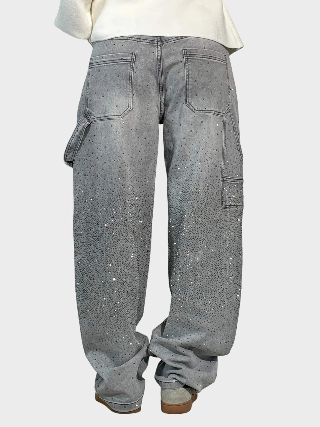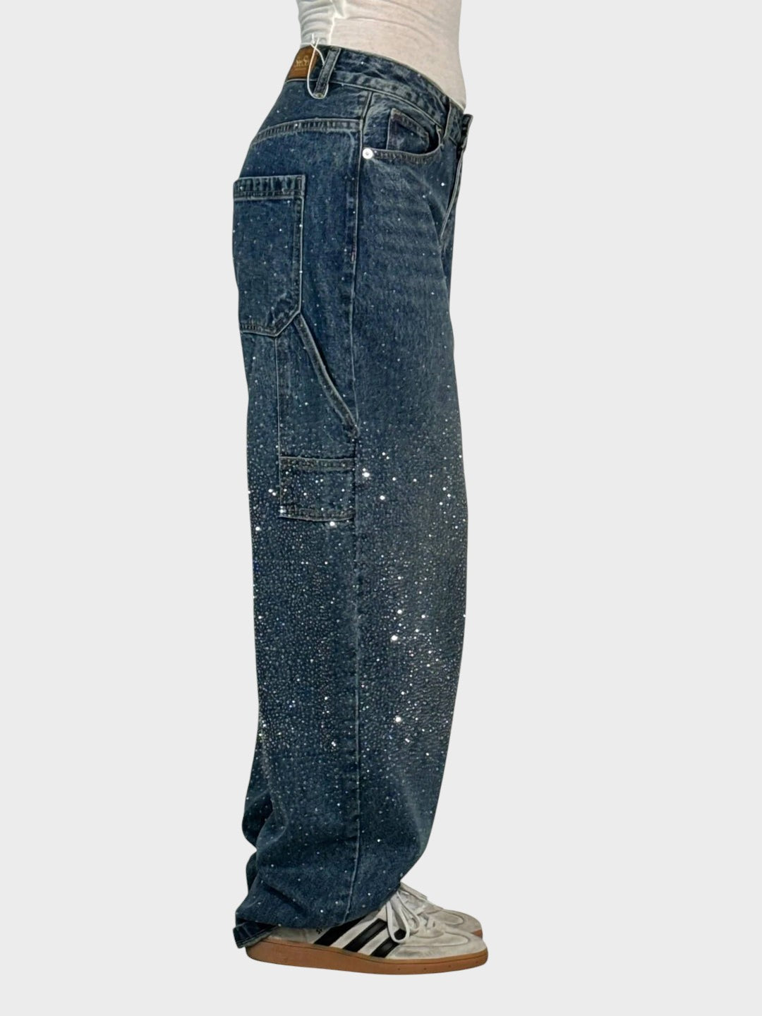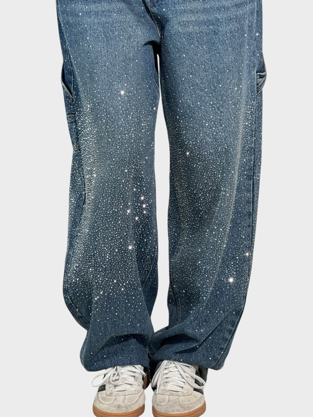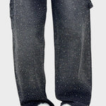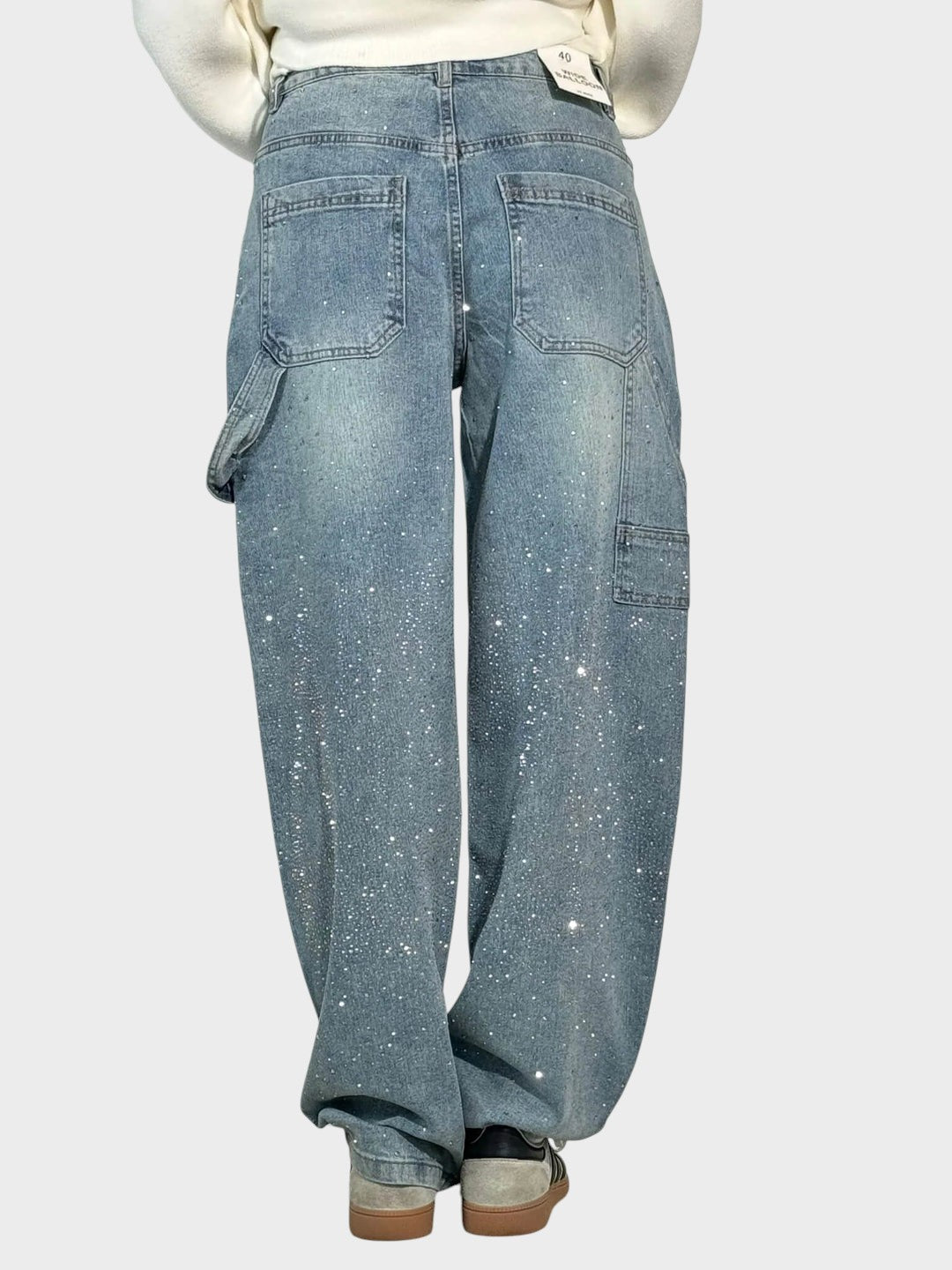 Tieto elegantne zdobené džínsy spájajú nadčasovú eleganciu s moderným pohodlím. Trblietavé detaily dodávajú luxusný nádych, zatiaľ čo voľný strih vytvára lichotivú siluetu. Perfektné pre štýlové každodenné outfity s jemným špeciálnym akcentom.
