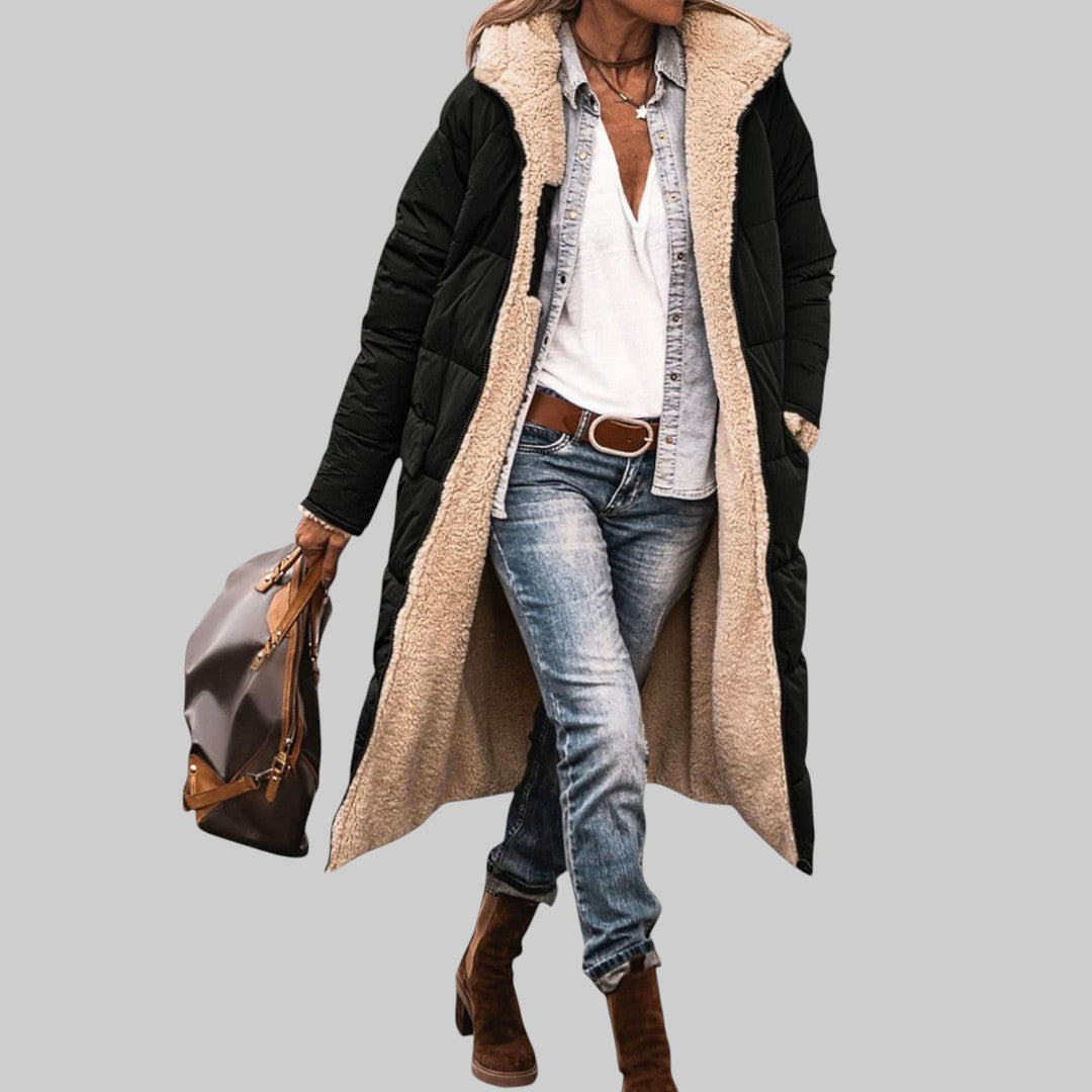 Kabát Lucia ponúka obojstranný dizajn, ktorý vám poskytuje dva štýlové vzhľady v jednom. Vďaka predĺženému strihu poskytuje teplo aj sofistikovanosť, čo z neho robí ideálnu voľbu na chladnejšie dni.